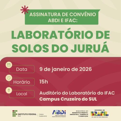 A Agência Brasileira de Desenvolvimento Industrial (ABDI) e o Instituto Federal do Acre (IFAC) assinam, nesta sexta-feira (9), convênio para a implantação do Laboratório de Análises de Solos e Tecido Vegetal no Campus Cruzeiro do Sul. A iniciativa integra ações voltadas ao fortalecimento da produção agrícola regional.