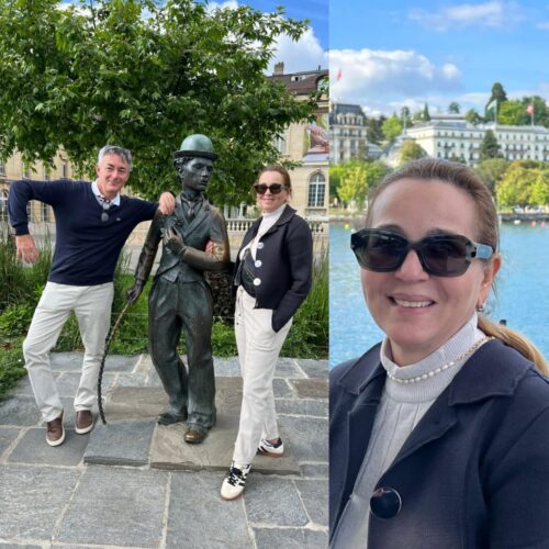 Casal de empresários, Alain e Gladys Mubárac Riviere, desfrutando de merecidas férias na cidade de Lauzanne, na Suíça. No passeio uma pausa (na estátua) reverenciando o maior ator, diretor, comediante e cineasta do cinema mudo, o imorta, Charles Chaplin. O suntuoso palácio atrás de Gladys é o hotel “Beau Rivage Palace”, e o lago Léman, em Lauzanne, Suíça