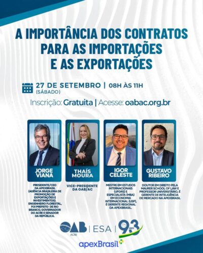 A Ordem dos Advogados do Brasil – Seccional Acre (OAB/AC), em parceria com a ApexBrasil, promove neste sábado, 27 de setembro, das 8h às 11h, a palestra “A importância dos contratos para as importações e as exportações”, no auditório da instituição em Rio Branco. O evento é gratuito e aberto à participação de advogados, estudantes e profissionais interessados em comércio exterior.