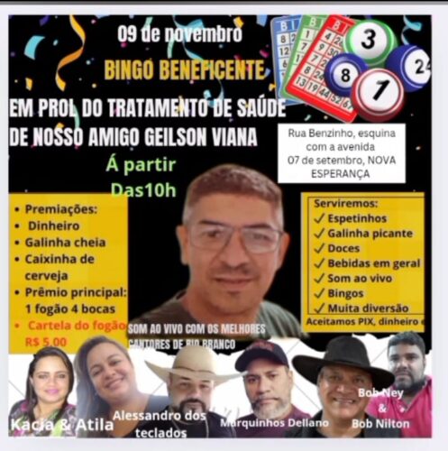 O evento contará com shows de Bob Ney & Bob Nilton, Marquinhos Dellano, Alessandro dos Teclados e Kacia & Átila, além de venda de comidas e bebidas. A cartela do bingo de um fogão custa R$ 5,00. Também serão sorteados outros prêmios, ao longo da ação solidária entre os amigos de Jeilson.